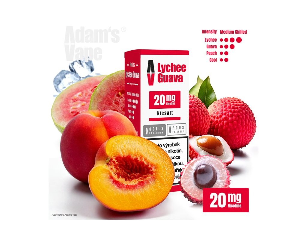 Voňavé liči přináší neodolatelně šťavnatý zážitek, který se plynule spojuje s jemnou, krémovou chutí guavy. Ta celou směs obohacuje o lehkou citrusovou svěžest a příjemnou hladkost, díky níž je každý tah naprosto vyvážený a osvěžující. Ideální volba pro všechny, kdo milují netradiční, exotické příchutě s osvěžujícím charakterem. Adam’s Vape vám přináší prémiové hotové náplně do elektronických cigaret na bázi nikotinových solí (Nicsalt) s intenzitou 10 a 20 mg. Jejich chuťový profil je bohatý, moderní a osvěžující, ideální pro každodenní vapování. V nabídce najdete jak inovativní kombinace příchutí, tak osvědčené bestsellery inspirované oblíbenou řadou Shake and Vape. Hotové náplně jsou ideální pro pody a šetrné ke spirálkám / cartridgím. Poměr PG/VG 50:50.