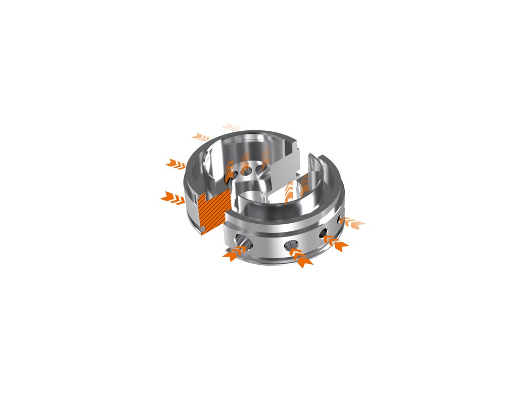 Ve spodní části najdete propracovaný airflow systém, který tvoří řada různě velkých otvorů pro perfektní kontrolu nad přísunem vzduchu do atomizéru. Najdete zde otvory s průměry 1,0 mm, 1,2 mm, 1,5 mm, 1,8 mm a 2,5 mm. Celý systém je také navržen pro co nejlepší odvod přebytečného tepla z těla atomizéru.