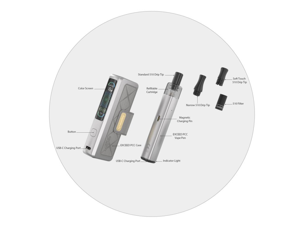 Joyetech Exceed PCC Kit je moderně zpracovaná souprava dobíjecí powerbanky a kompaktního pod systému, která uživatelům přináší obrovskou svobodu v užívání díky inteligentnímu čipsetu Avatar Chip a obrovské kapacitě baterie. S praktickým displejem přímo na těle powerbanky si navíc můžete nastavovat výkon a budete mít neustálý přehled o všech funkcích. Nastavení je hravé, snadné, rychlé a intuitivní, sadu tak ocení jak začátečníci, tak také pokročilí vapeři, jedná se o jedinečnou stylovku vhodnou jak do společnosti, tak také pro každodenní chvíle pohody.