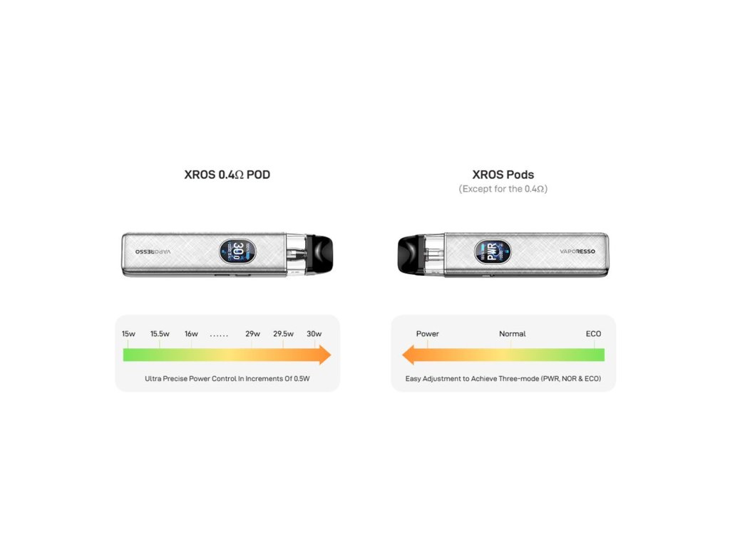 S regulací výstupního výkonu si nebudete muset dělat žádné starosti. Zařízení je vybaveno moderními přednastavenými režimy intenzity potahování, ihned po připojení cartridge si tak změří její odpor a nastaví vhodný doporučený výkon automaticky. Ten si poté můžete změnit jedním ze tří režimů intenzity PWR, NOR a ECO. Pokud si k e-cigaretě připojíte samostatně prodávanou cartridge s odporem 0,4ohm, můžete si u ní regulovat výstupní výkon až do 30W. Nastavení ještě nikdy nebylo jednodušší.
