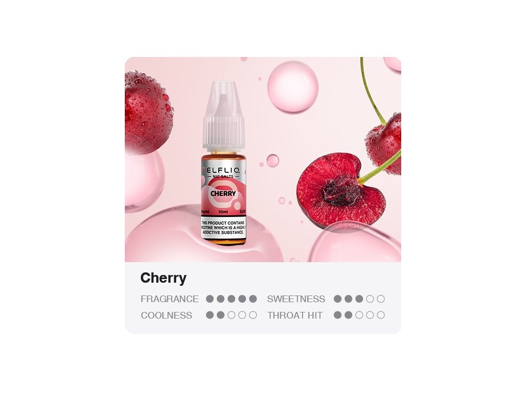 Tradiční třešňová příchuť... Společnost Elf Bar je ve světě vapingu opravdovým fenoménem dnešní doby. Jejich jednorázové elektronické cigarety si našly miliony příznivců po celém světě, a to díky jejich nezapomenutelné a jedinečné chuti liquidu. Nyní si pro svoje fanoušky Elf Bar přichystal i samotný E-liquid ELFLIQ Nic SALT, který se od běžných liquidů odlišují tím, že má nižší PH a obsahuje nikotinovou sůl, díky které dochází k rychlejší a kvalitnější vstřebatelnosti = bez dráždivého pocitu v krku oproti klasickým liquidům. Vyvážený poměr 50VG/50PG je vhodný do všech typů elektronických cigaret.