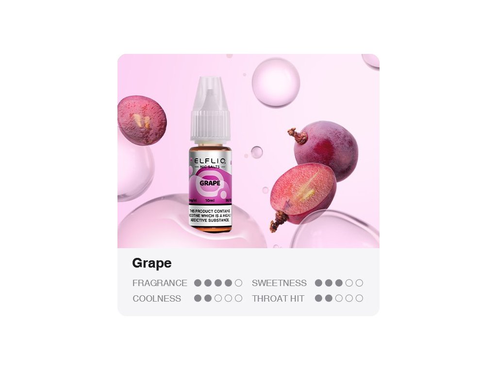 Chuť čerstvých hroznů se sladkokyselou dochutí... Společnost Elf Bar je ve světě vapingu opravdovým fenoménem dnešní doby. Jejich jednorázové elektronické cigarety si našly miliony příznivců po celém světě, a to díky jejich nezapomenutelné a jedinečné chuti liquidu. Nyní si pro svoje fanoušky Elf Bar přichystal i samotný E-liquid ELFLIQ Nic SALT, který se od běžných liquidů odlišují tím, že má nižší PH a obsahuje nikotinovou sůl, díky které dochází k rychlejší a kvalitnější vstřebatelnosti = bez dráždivého pocitu v krku oproti klasickým liquidům. Vyvážený poměr 50VG/50PG je vhodný do všech typů elektronických cigaret.