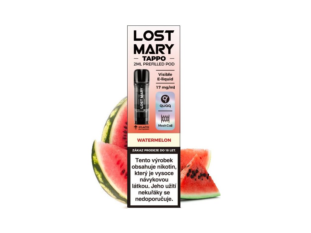 Osvěžující a lahodná chuť vodního melounu... Předplněné cartridge LOST MARY TAPPO obsahují prémiový liquid o objemu 2ml. Nedílnou součástí cartridge je spirálka Mesh QUAQ, která kombinuje ultra jemnou síťovinu s vysoce absorpční bavlnou. Tyto cartridge jsou plně kompatibilní s bateriemi LOST MARY TAPPO, TAPPO AIR a Elf Bar ELFA. Poměr 50VG/50PG