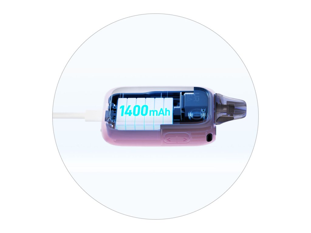 V kapesním těle e-cigarety se ukrývá integrovaná baterie s překvapivě velkou kapacitou. Ta se zastavila na 1400 mAh a poskytne tak dostatek výdrže pro mnohahodinové nerušené potahování a pro intenzivní používání. Díky obrovské kapacitě si hravě vychutnáte až celodenní výdrž a baterii si budete moci kdykoliv opětovně dobít díky modernímu portu USB-C s podporou nabíjení 1A.