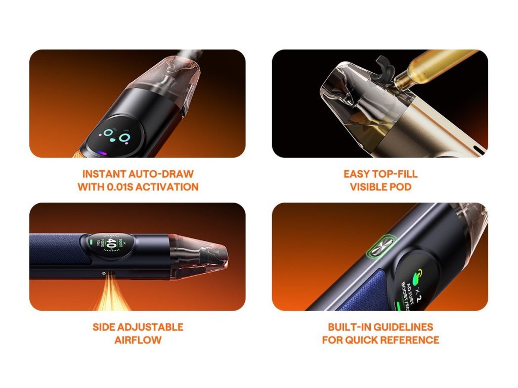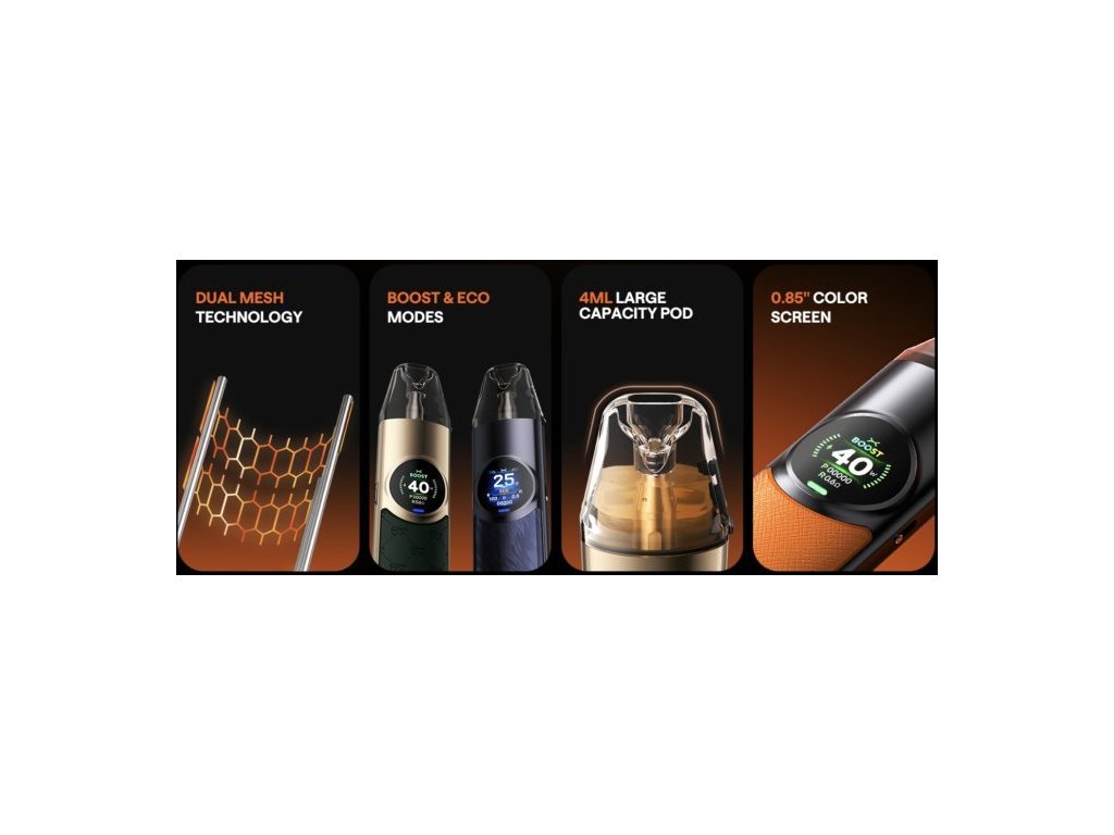 Součástí zařízení je velkokapacitní 4ml cartridge, která umožňuje více než 15 naplnění a disponuje 5vrstvou ochranou proti úniku, což zaručuje spolehlivý a čistý provoz. Přehledný 0,85" barevný displej poskytuje snadný přístup ke všem nastavením zařízení a zobrazuje důležité informace. Integrovaná 1500mAh baterie s rychlým nabíjením 5V/2A zajišťuje dlouhou výdrž a rychlé doplnění energie. Kromě toho zařízení umožňuje nastavení výkonu v rozmezí 5–40 W, díky čemuž si každý uživatel může přizpůsobit zážitek z vapování podle svých preferencí.
