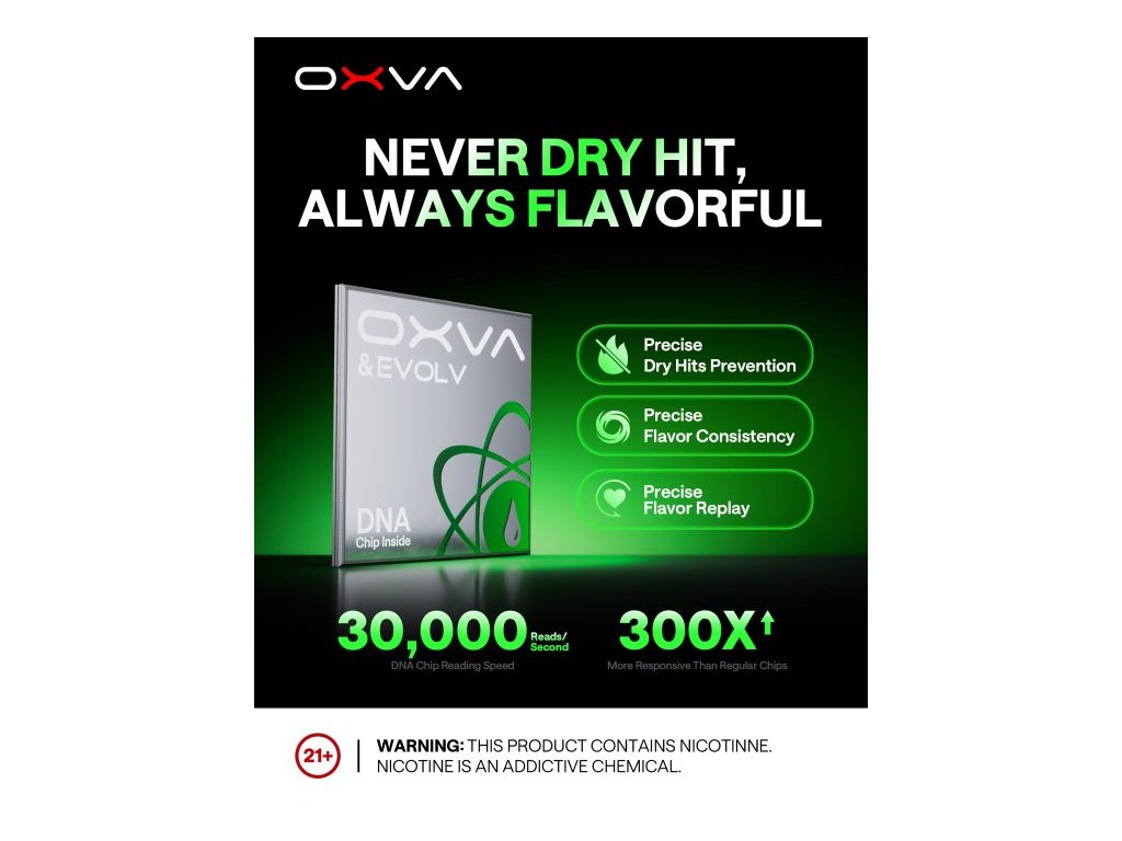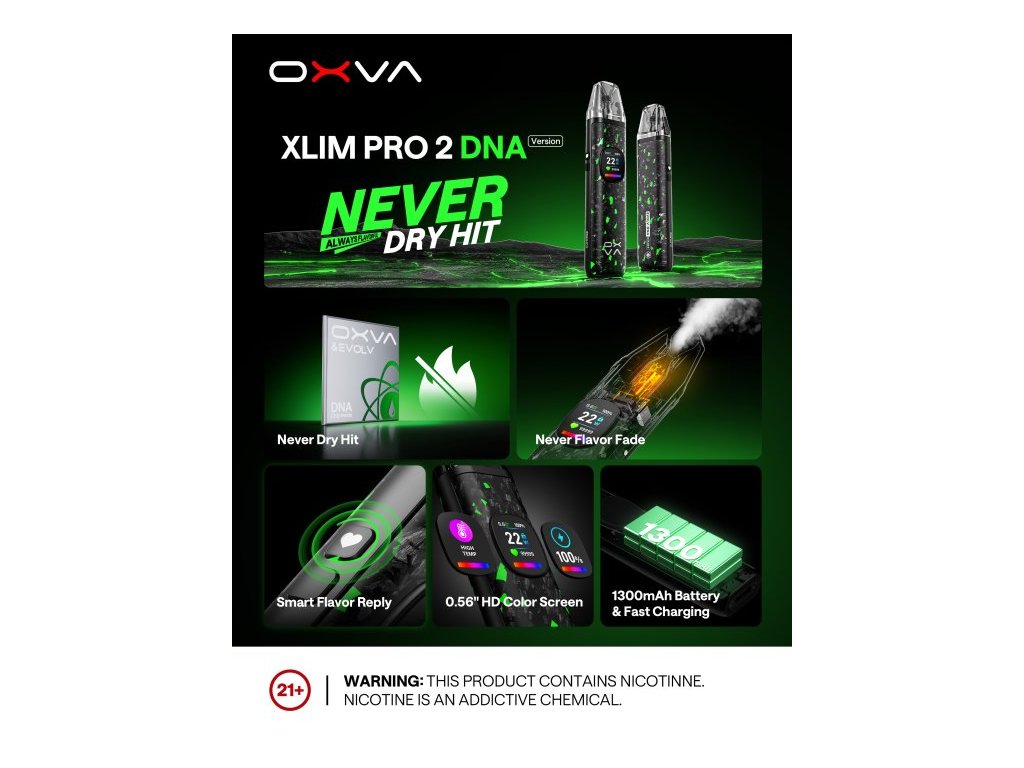 Prémiový pod systém OXVA XLIM PRO 2 DNA je postavený na pokročilém čipu EVOLV DNA, který je v komunitě pokročilých vaperů považován za technologický standard v oblasti přesnosti, bezpečnosti a uživatelské kontroly. Tento čip je vybaven technologií Replay, která umožňuje „zapamatovat si“ ideální potah a následně ho přesně opakovat – čímž zajišťuje konzistentní chuť při každém použití. Zároveň obsahuje systém ochrany proti dry hitu – čip analyzuje stav spirálky až 30 000 krát za sekundu a včas upraví výkon tak, aby nedošlo k připálení vaty ani při nízké hladině e-liquidu. Výsledkem je nejen lepší chuťový zážitek, ale i delší životnost cartridge. Tělo zařízení z luxusního kovaného karbonu a zinkové slitiny nejen skvěle vypadá, ale také vydrží každodenní používání. Baterie s kapacitou 1300mAh podporuje výstupní výkon až 30W a ve spojení s rychlým nabíjením přes USB-C (5V/2A) je ideální pro celodenní provoz bez zbytečných prostojů. Vapování je maximálně přizpůsobitelné – zařízení nabízí automatické i tlačítkové spouštění, boční regulaci airflow a k tomu 0,56´´ barevný displej, na kterém máš všechny údaje přehledně zobrazené. Pokročilejší uživatelé navíc ocení možnost plného přizpůsobení výkonových křivek a parametrů přes Evolv Escribe software na PC.