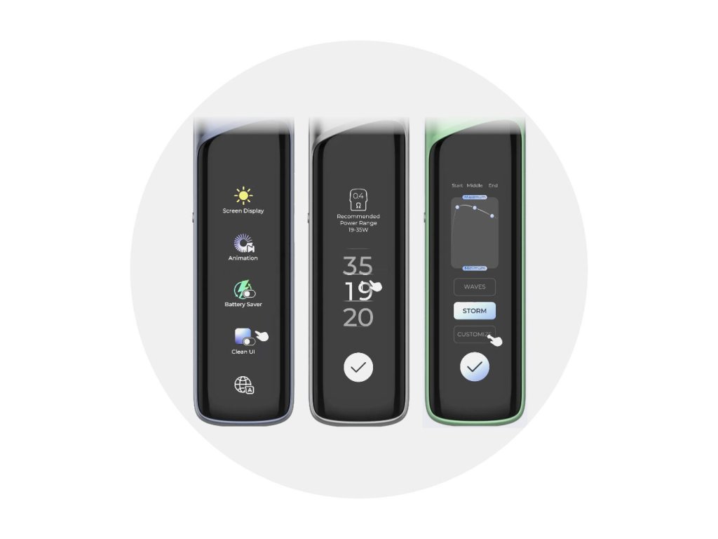Storm, Waves a Custom - tři výstupní režimy, kterými si můžete obohatit váš vaperský zážitek. Režim Storm nabízí silný hit a bohatou chuť, Waves plynulý nástup s vyváženým profilem a konečně Custom, který vám dává naprostou svobodu v nastavení. Průběh výkonu si jednoduše upravíte ve třech fázích každého potahu - na začátku, uprostřed a na konci.