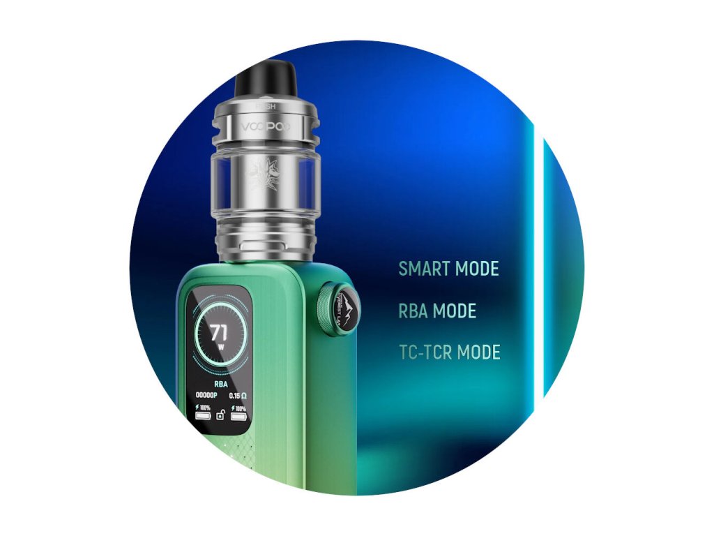 Upgradovaná verze integrovaného čipsetu umožňuje výběr hned ze tří režimů vapování. V režimu Smart s automatickou detekcí odporu žhavící hlavy elektronika sama zvolí optimální nastavení a omezí maximální výkon pro daný typ tělíska. Ovládání modu je tak dostatečně jednoduché i pro méně zkušené vapery. RBA režim nabízí zcela variabilní nastavení výkonu od 5 do 220 W po 1 W, díky čemuž můžete experimentovat s výslednou chutí a množstvím páry. Poslední režim TC-TCR je určen pro vyznavače DIY vapingu a umožňuje regulaci podle teploty se čtyřmi přednastavenými typy vodičů - SS316, SS430, Ni200 a Titanium.