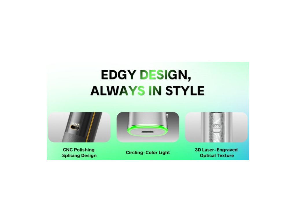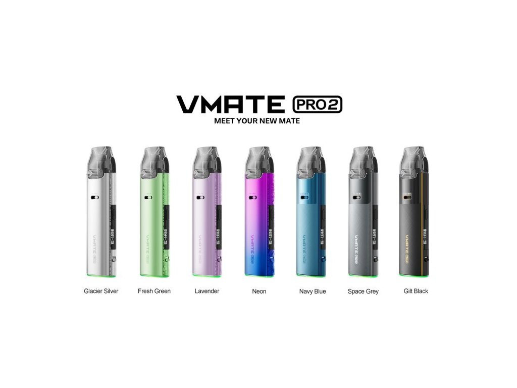 Prémiové zpracování zahrnuje CNC obráběný rám s matnou povrchovou úpravou, 3D laserové detaily a stylové cirkulární LED podsvícení. Vmate Pro 2 podporuje rychlé nabíjení přes USB-C, přičemž plné dobití zvládne za pouhých 40 minut. Kromě toho nabízí přehledné zobrazení stavu baterie, odporu, výkonu, počtu potahů a délky vapování. Kompatibilita s cartridgemi Vmate 0.4? a 0.7? zaručuje univerzální použití. K dispozici je v 7 moderních barevných variantách.